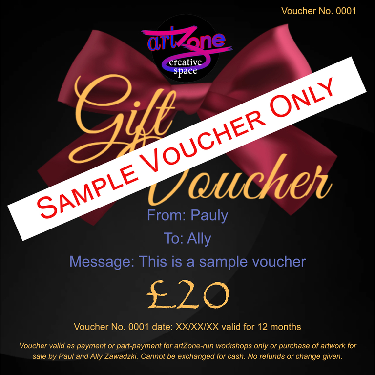 They can be used as payment or part payment for artZone run workshops only or purchase of artwork for sale by Ally or Paul Zawadzki.