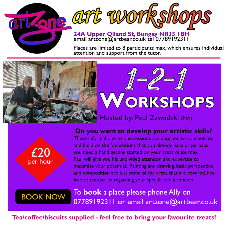 Introducing a regular series of workshops held in our dedicated space in Bungay. The workshops will cover a wide range of subject (oils, watercolour, acrylics, pencil, perspective etc) and abilities from absolute beginners to professionals wishing to develop their art in new directions.