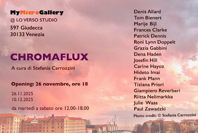 This innovative exhibition gathers the work of twelve artists hailing from countries across the world including: Australia, United States, Germany, Sweden, Finland, China, England, Italy. Their work features mostly painting, sculptures and video. These various interpretations of the artists gestures toward different dimensions reach beyond their existential realities, as subjective perspectives implicate an aesthetic of the Chromaflux. Color is the primordial language of existence, a reflection of the world that inhabits us and the one we inhabit. Every hue is a breath, a heartbeat, an emotion etched into the invisible fabric of time. The flow of color is never static: like a river, it moves, blends, transforms. Life, like color, never stands still. It is a continuous flow, a dance of light and shadow that intertwine, embrace, and drift apart. Color is the vehicle through which the world speaks to our soul, and we, often unknowingly, respond. We respond in gestures, in glances, in choices even in silence. Chromaflux is this: the awareness that color is not just something to see but to feel. It is the visual representation of our inner breath, the rhythm of our being. Learning to let this flow pass through us without resistance means embracing the unpredictability of life and accepting that every shade has its moment, its reason. There is no “right” or “wrong” color, just as there is no right or wrong way to live. There is only movement the constant flow that shapes and transforms us, teaching us that, in the end, the Chromaflux is a visual and sensorial journey that explores the transformative power of color. It is not just a performance: it is an immersive experience where color becomes alive, fluid and constantly changing. Each shade is a force in motion, a wave that expands and contracts, intertwining with the emotions of the viewer. In Chromaflux, color is not confined by matter, but liberated through light, transparency and iridescent surfaces. Each work invites the observer to grasp the fluid and unpredictable nature of color, which changes depending on the perspective and intensity of the light. The chromatic flow symbolizes the instability and beauty of life itself: a continuous movement, never the same. Like water or wind, color reflects the mutability of human emotions, their ability to transform and influence each other. Chromaflux invites you to let go, to get lost in the flows of color and light, finding a form of personal order in the apparent chaos. In this chromatic flow, there is room for interpretation and for dreaming, a place where art dissolves into pure sensation. True art lies not in controlling color but in flowing with it. After Paris Chromaflux is the second edition of the exhibition. Artists are represented by MyMicroGallery.